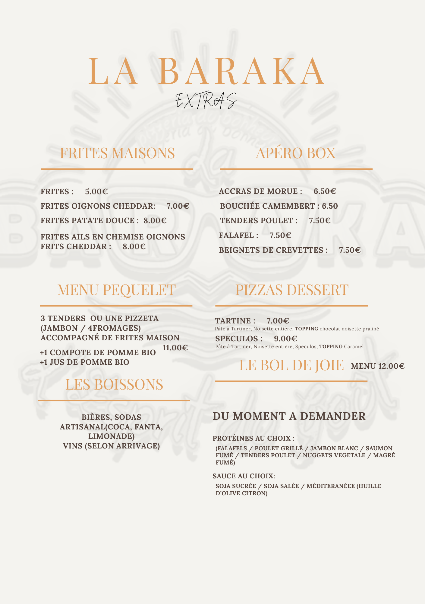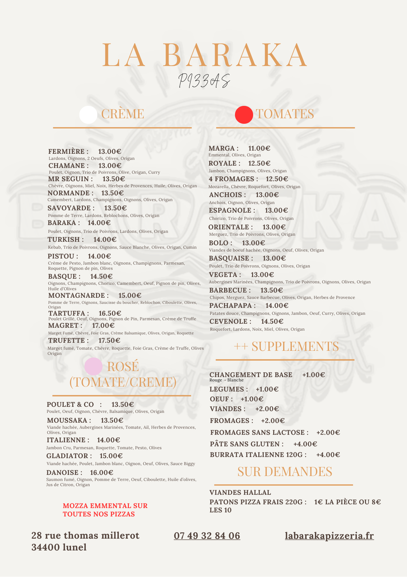 La Baraka innove pour 2023 ! Nous vous proposons désormais des pizzas sans gluten, sans lactose et Vegan. Mais bien sur en plus des pizzas traditionnelles.